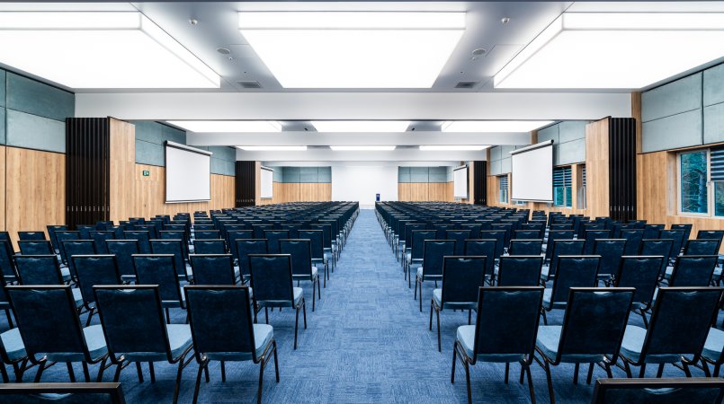 Sale konferencyjne wyposażone są w szybkie łącze internetowe, projektory i nagłośnienie, dzięki czemu transmisje online przebiegają bez zakłóceń.
